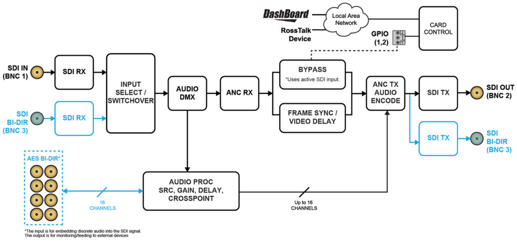 The AMX-8952 4K UHD 12G-SDI Embedder / De-embedder provides a cost-effective solution that allows facility engineers and systems integrators to incorporate discrete audio signals into HD, 3G and 12G-SDI infrastructures. As an openGear solution, it is part of an open eco-system of products that use industry-standard frames and leverage DashBoard’s unified control.